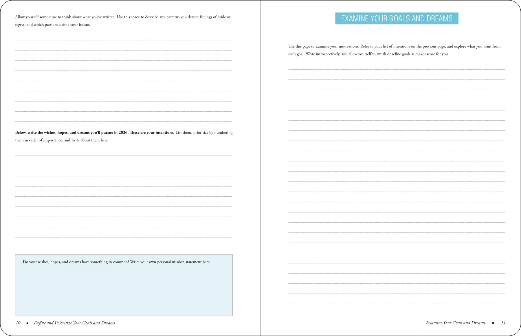 Covers 14 months (November 2025 through December 2026) with weekly prompts to define priorities, map out goals, and evaluate progress.