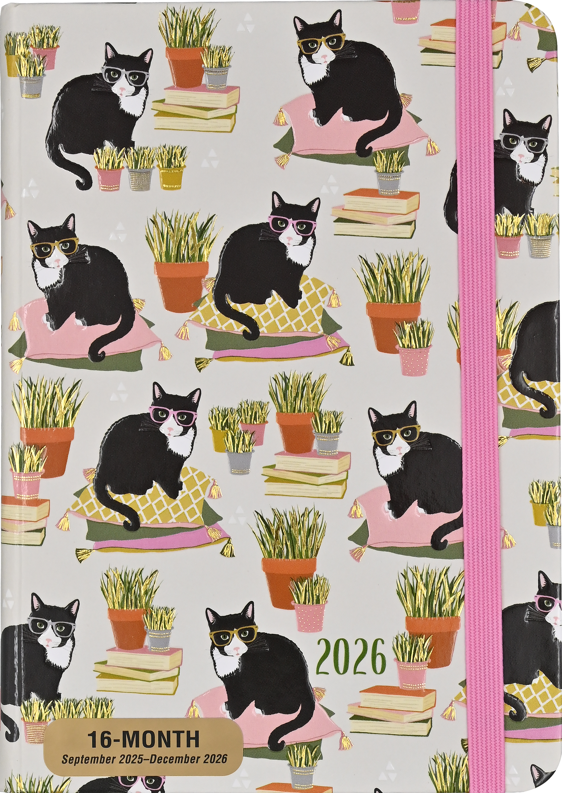 Cute Smarty Cats planner features a bestselling 2-page spread for organising your week. Includes monthly and weekly pages with helpful references and ample space for notes. Covers 16 months from September 2025 to December 2026.