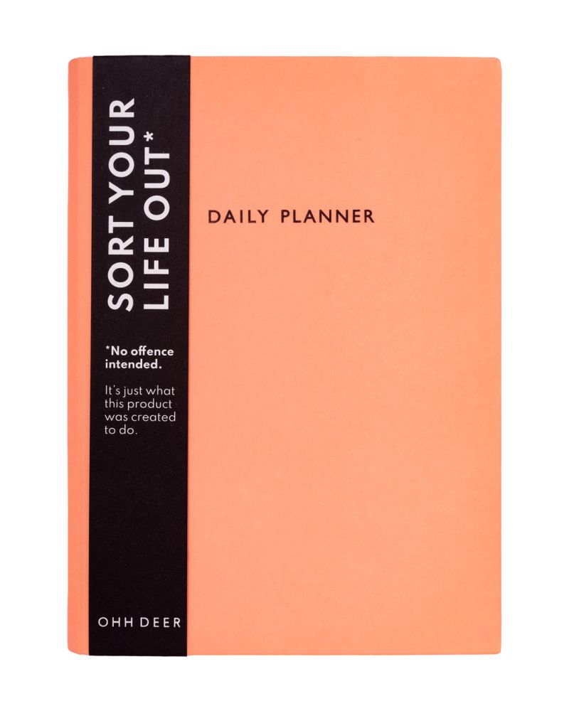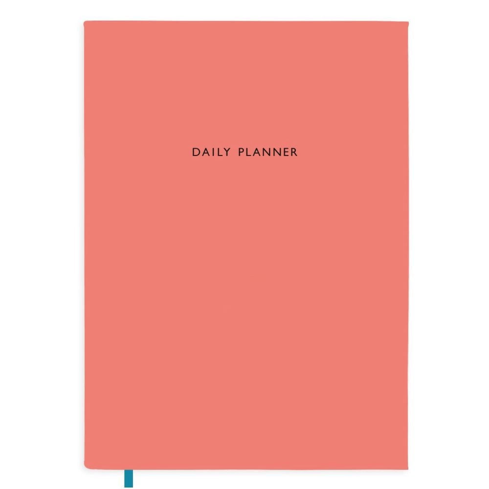 This A5 daily planner features a semi-flexible coral cloth cover and undated daily pages with space for notes, to-do lists, priorities, and appointments.