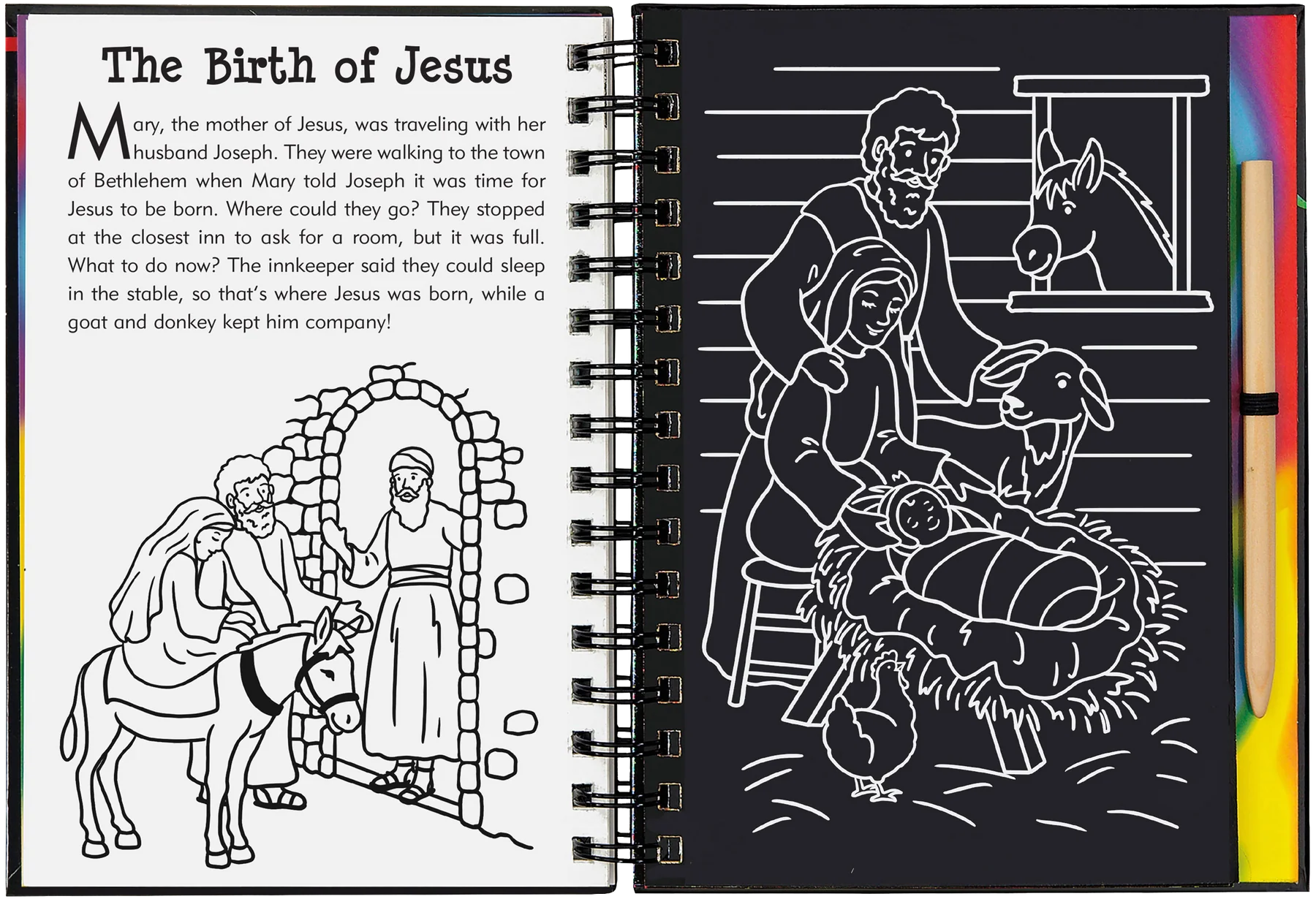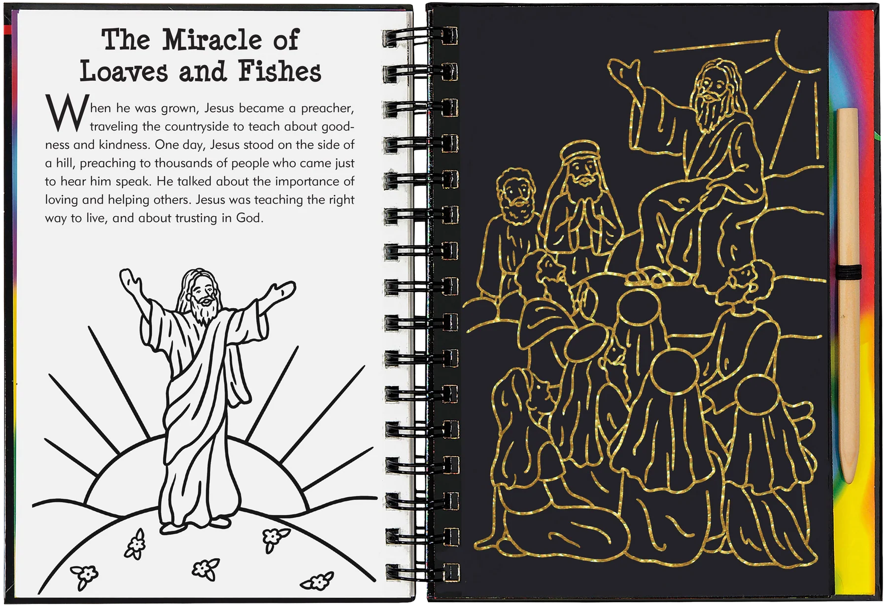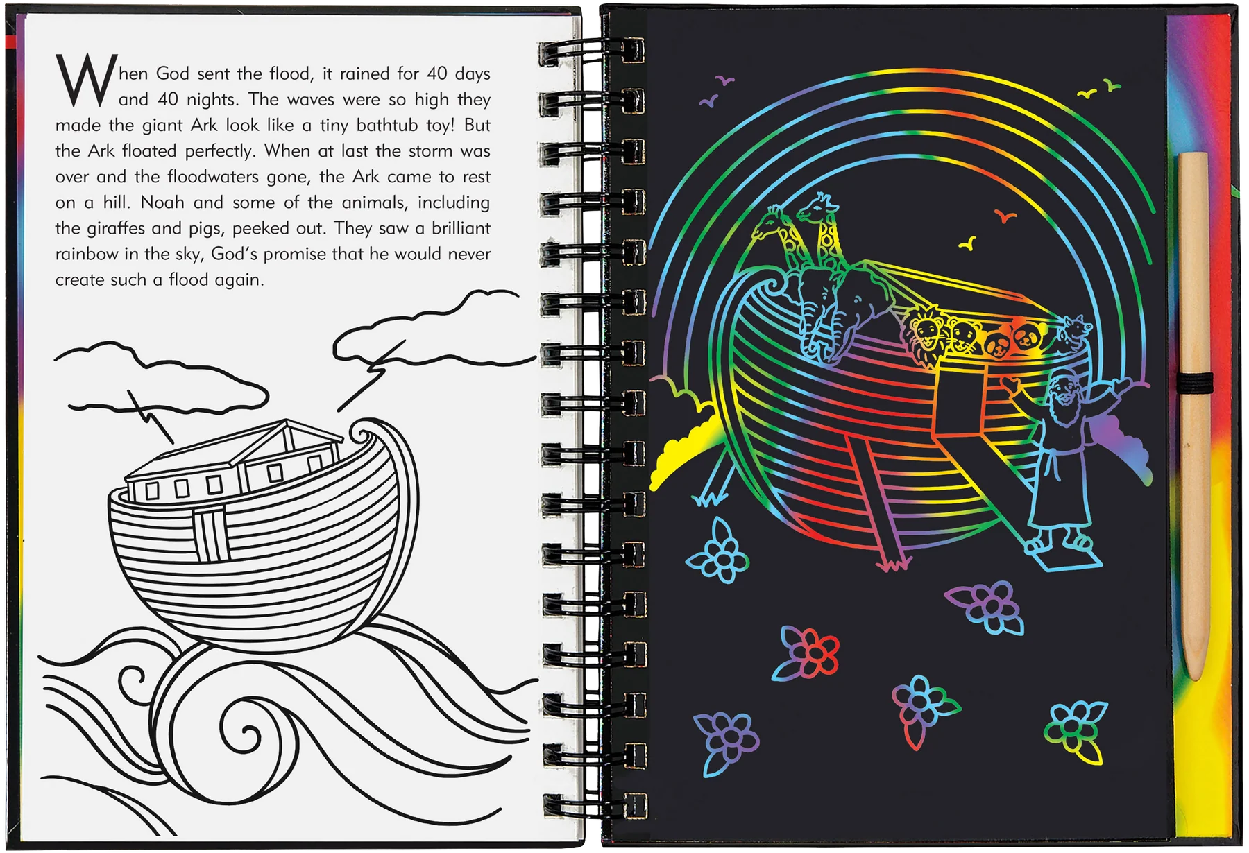 Bring Bible stories to life with this interactive Scratch and Sketch activity book! Trace through 10 beloved tales—5 from the Old Testament and 5 from the New Testament—revealing vibrant patterns, swirls, and holographic colors beneath black scratch-off pages.
