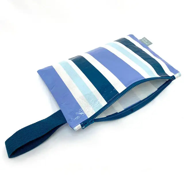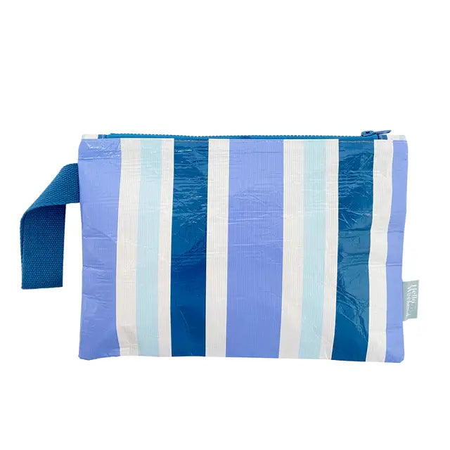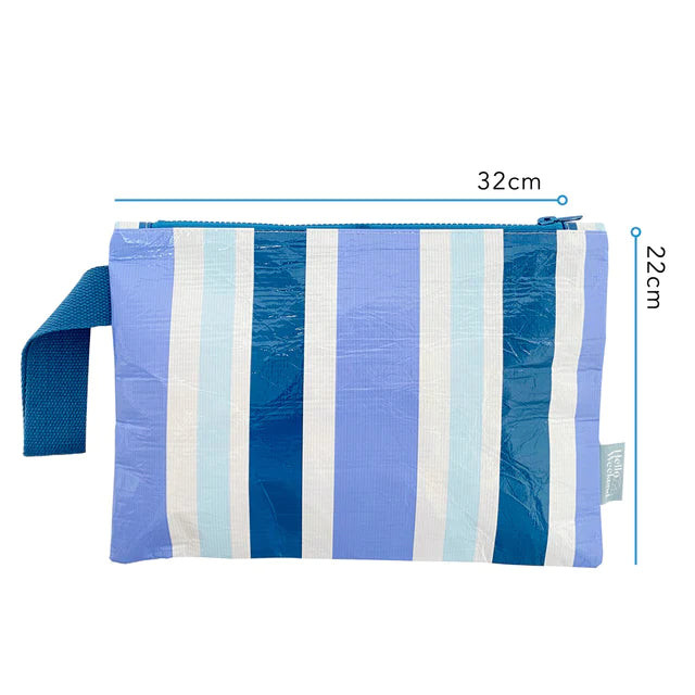 This vibrant zipper pouch features a bold pink, orange, blue, and white Calypso print, perfect for holidays and everyday use. Made from 100% recycled plastic bottles, it offers an eco-friendly alternative to single-use bags. Lightweight yet durable, it easily holds more than typical bags and wipes clean for convenience. Ideal for beach trips, picnics, or shopping, it folds flat for easy storage and includes a secure top zip and a 14cm woven wrist strap for effortless carrying.