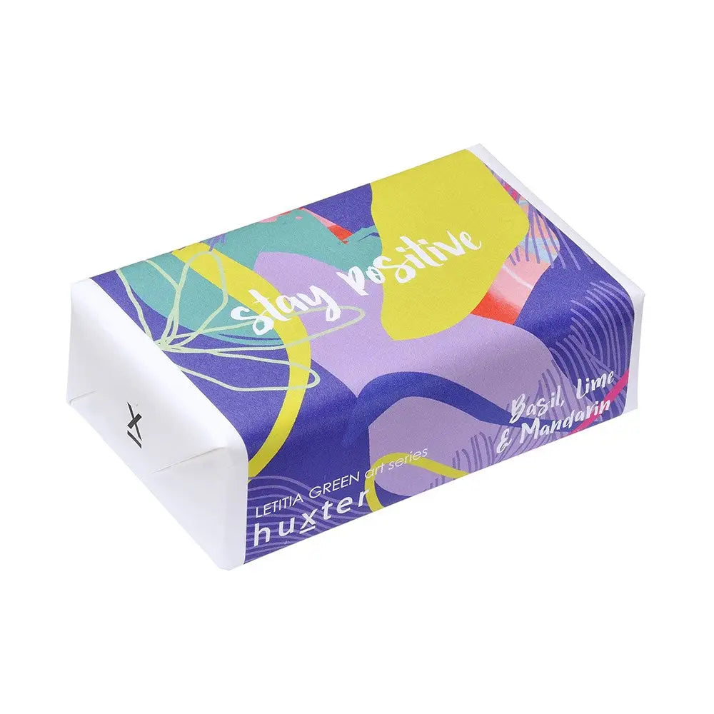Huxter Soap 'pacific' - Stay Positive is a 100% natural, triple-milled bar made with shea butter, coconut oil, goat milk, and almond oil for gentle, nourishing care. It produces a rich, creamy lather with a fresh Basil Lime & Mandarin scent. Hand-wrapped with original artwork by Letitia Green, this 200g soap is made in Australia and perfect for daily use or gifting.