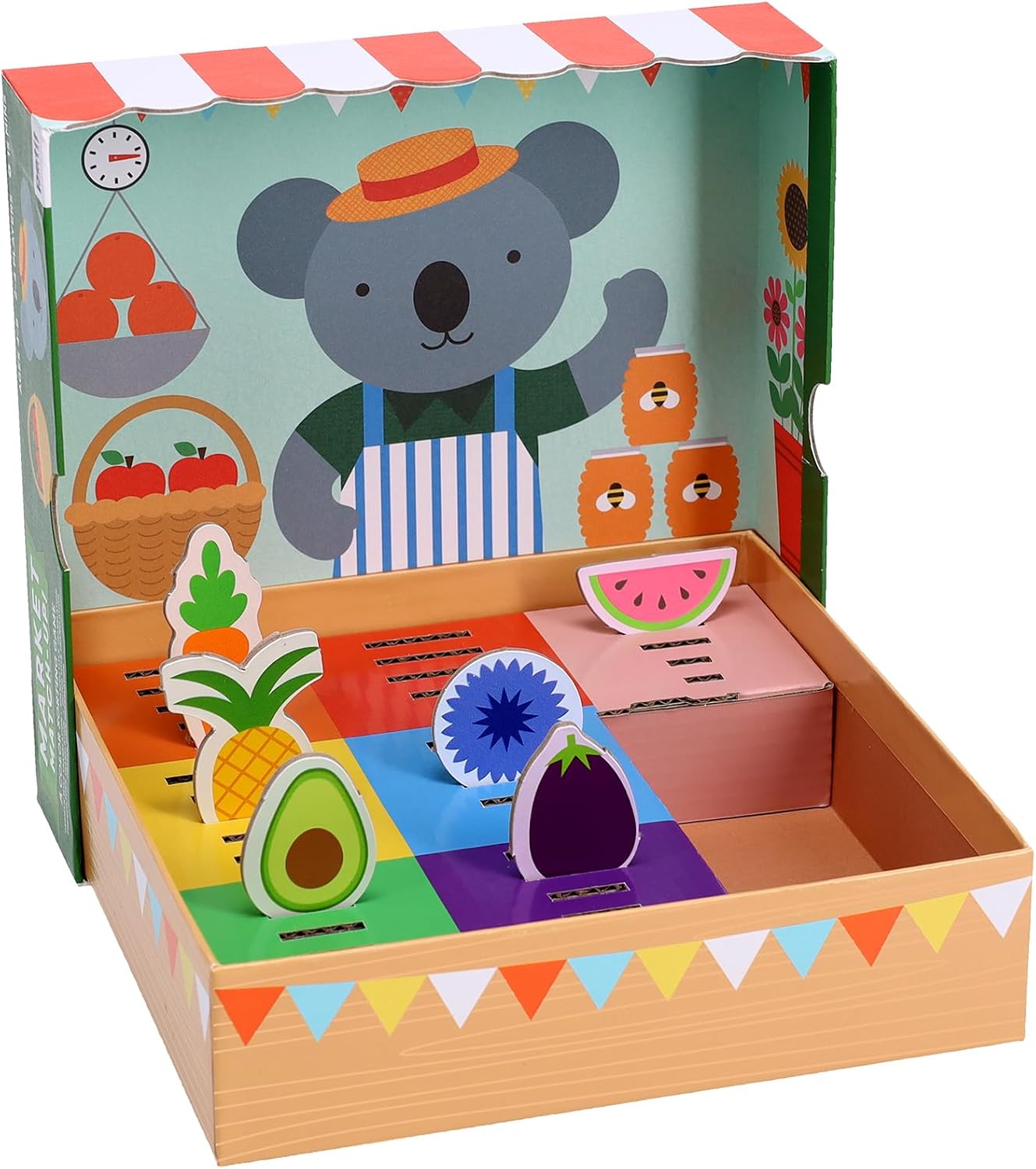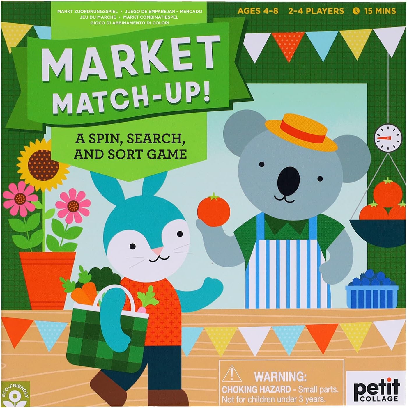 Market Match-Up is a memory and colour-sorting game for 2–4 players aged 4 and up.