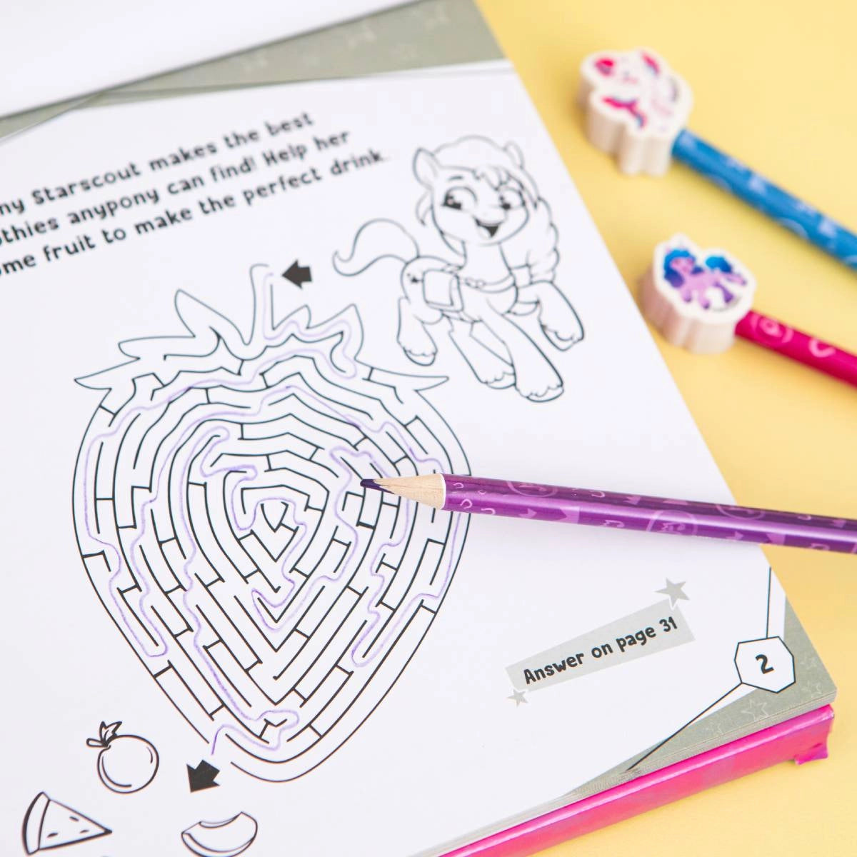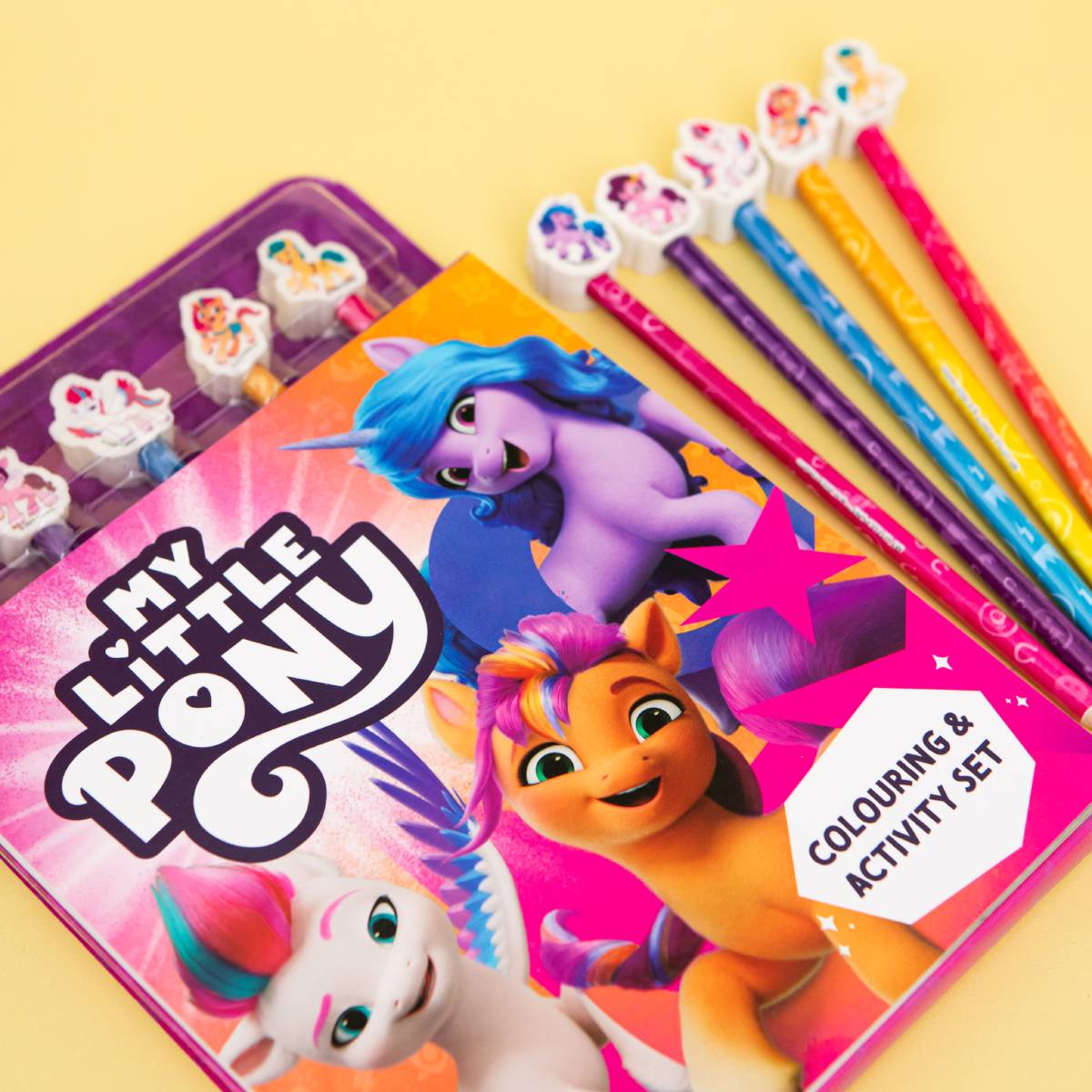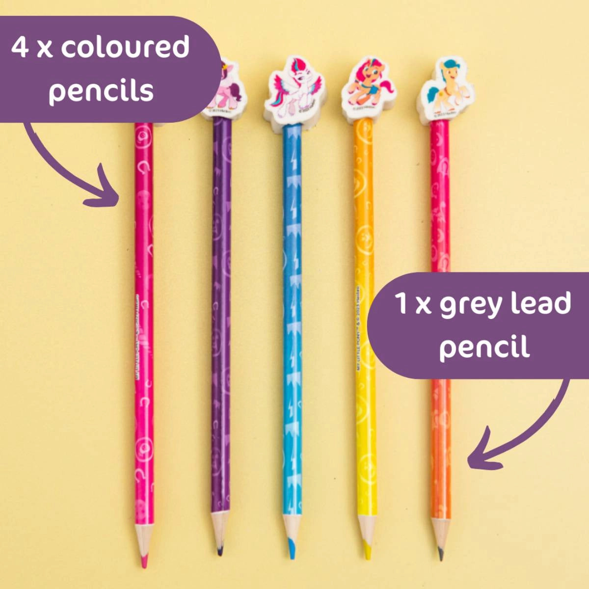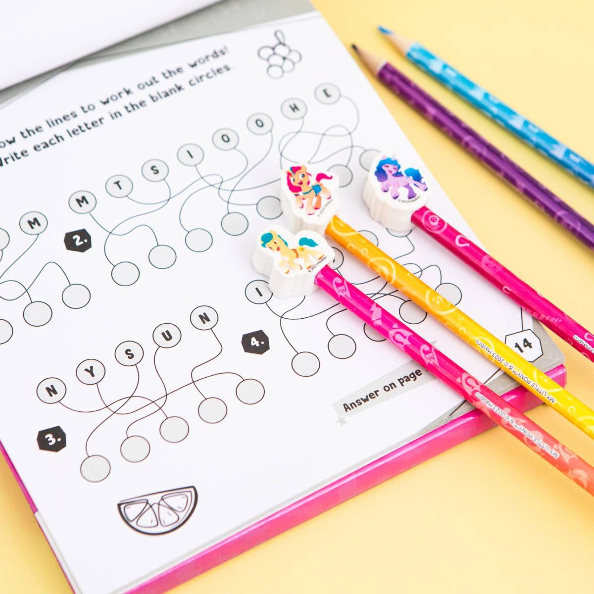 Step into a magical world of friendship with My Little Pony! Join Twilight Sparkle, Rainbow Dash, Pinkie Pie, and their friends on exciting adventures in Equestria. This set includes exciting activities and colouring pages featuring your favourite characters. With 5 pencils and erasers, bring these magical ponies to life!