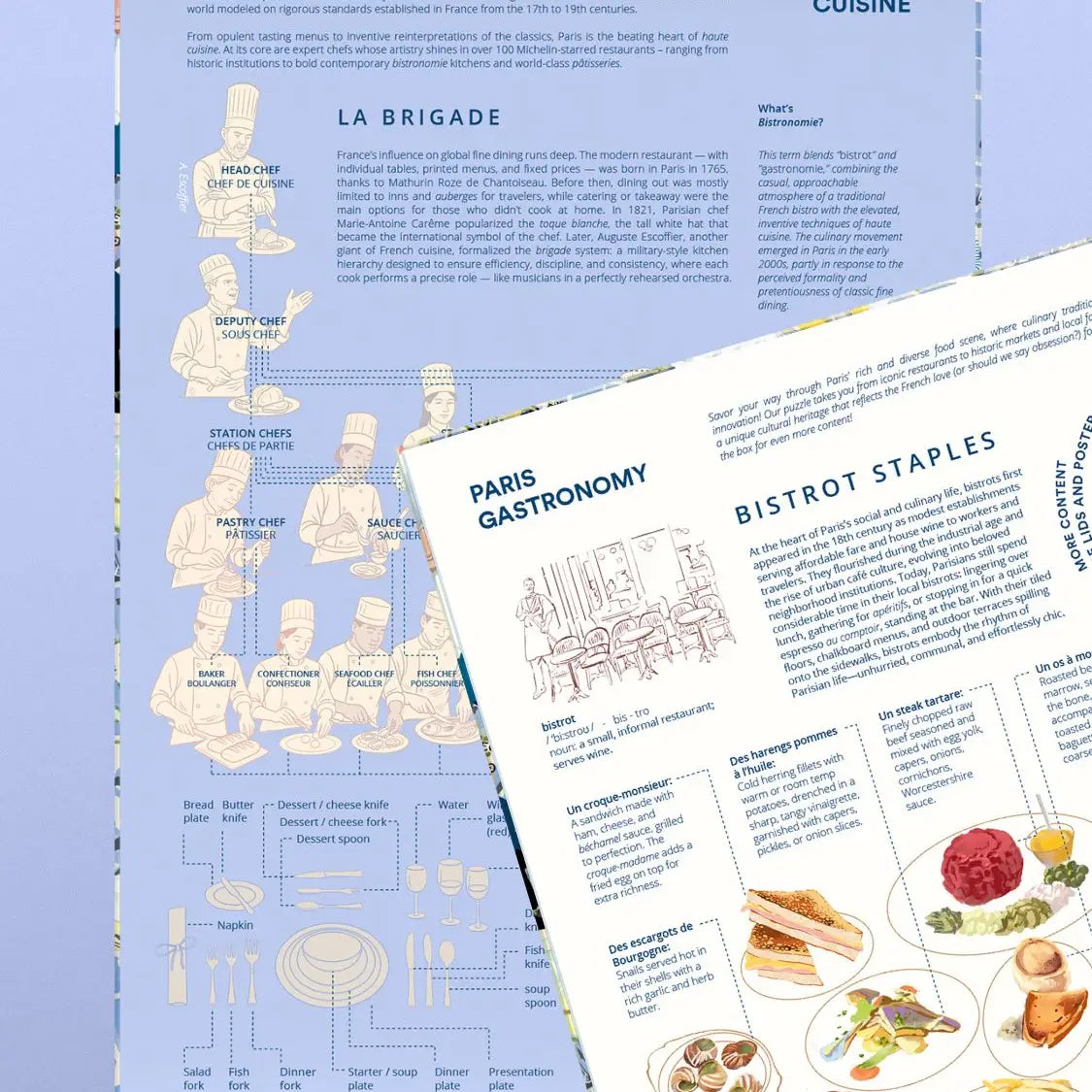 Experience Paris’s rich food culture with this 1000-piece gourmet puzzle. It features charming illustrations of classic dishes like steak frites and tarte Tatin, renowned restaurants, and historic markets. Learn about French fine dining, international influences, and culinary stories that shaped the City of Light. Includes a box stand, full-size map poster, and detailed facts to enhance your puzzling experience. Perfect for those who love food, travel, and French culture.